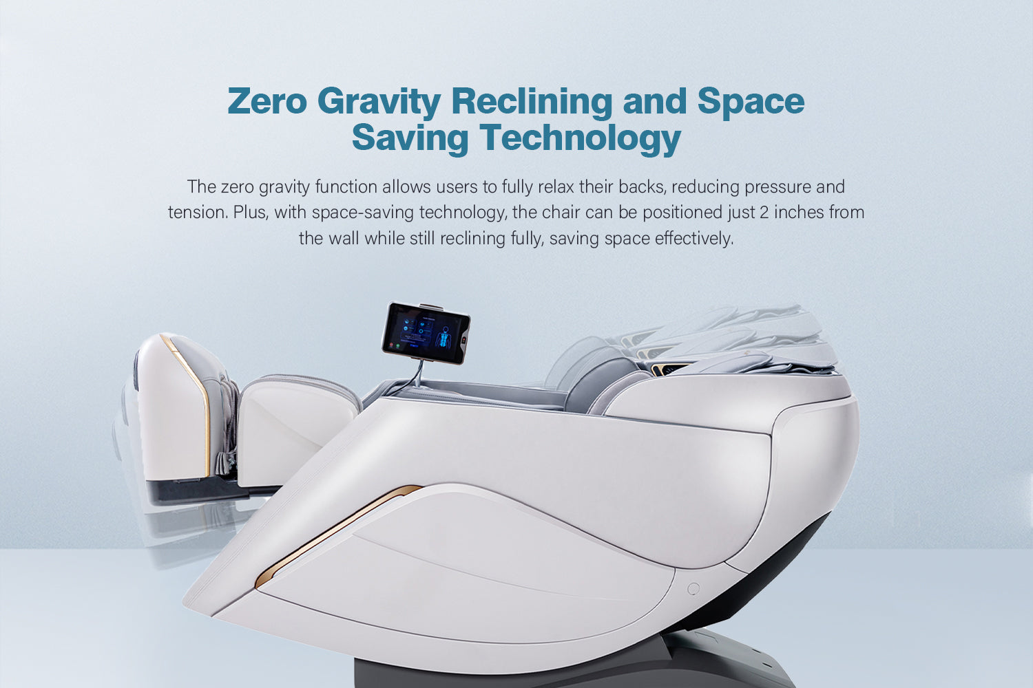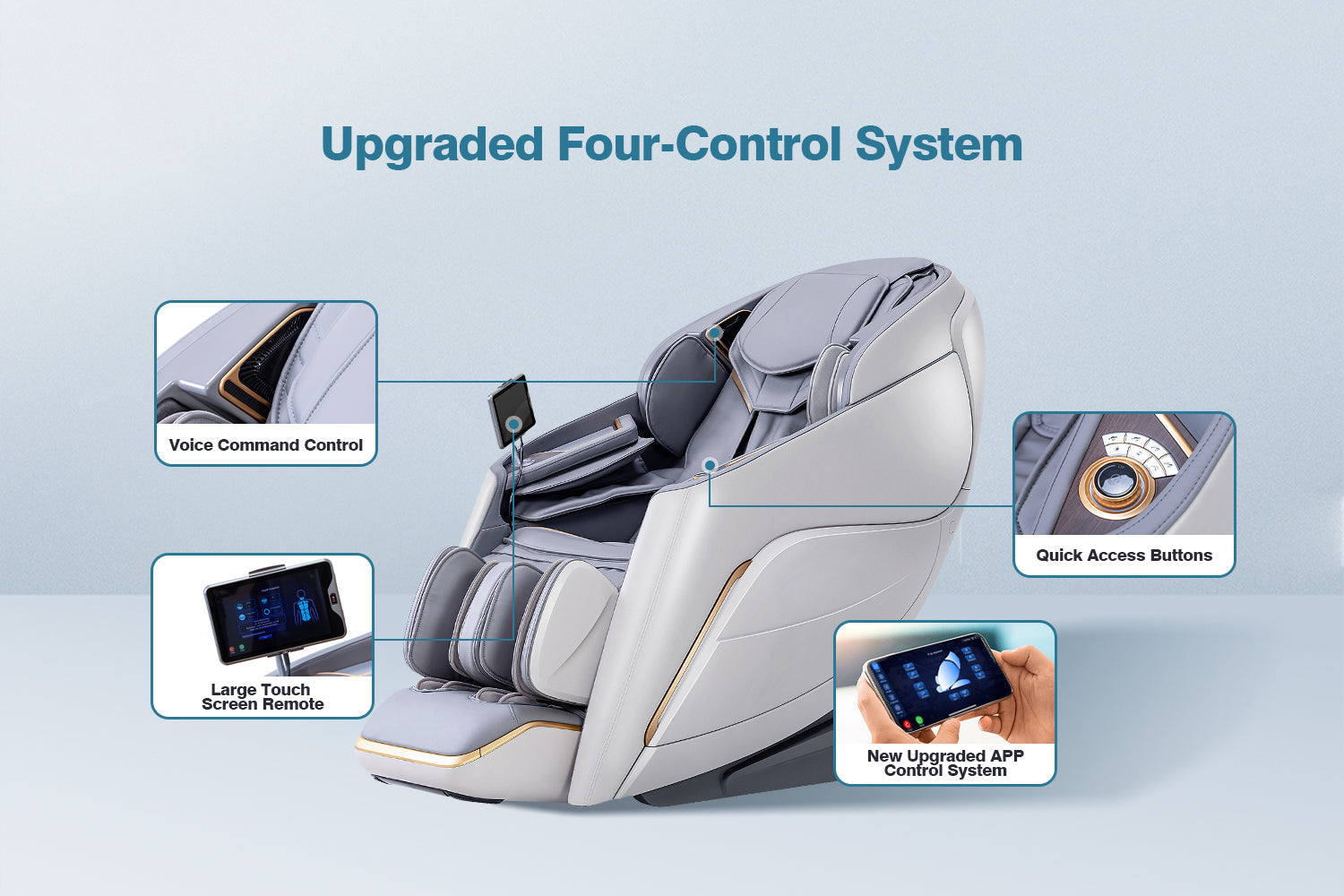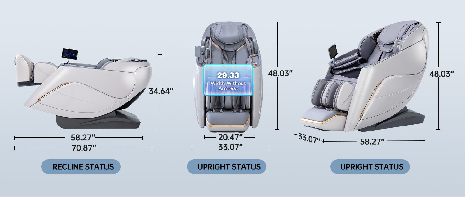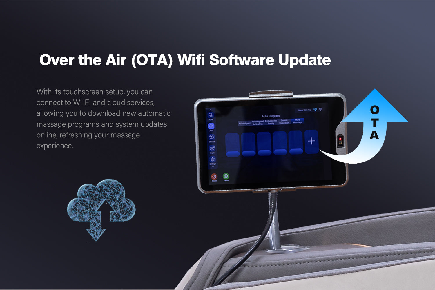 Advanced 4D Massage Mechanism Over the Air (OTA) Wifi Software Update Health Detection APP Control SL Long Track Massage from Neck to Hamstring area Program Customization & Recall Calf & Foot Roller Massage Automatic Footrest Extension Calf Airbag Kneading Massage Real Full Body & Zero Gravity Massage Touch Screen Remote & Quick Access Buttons Voice Command Control Wireless Charging Bluetooth