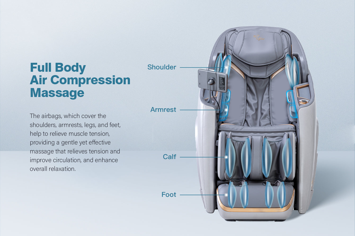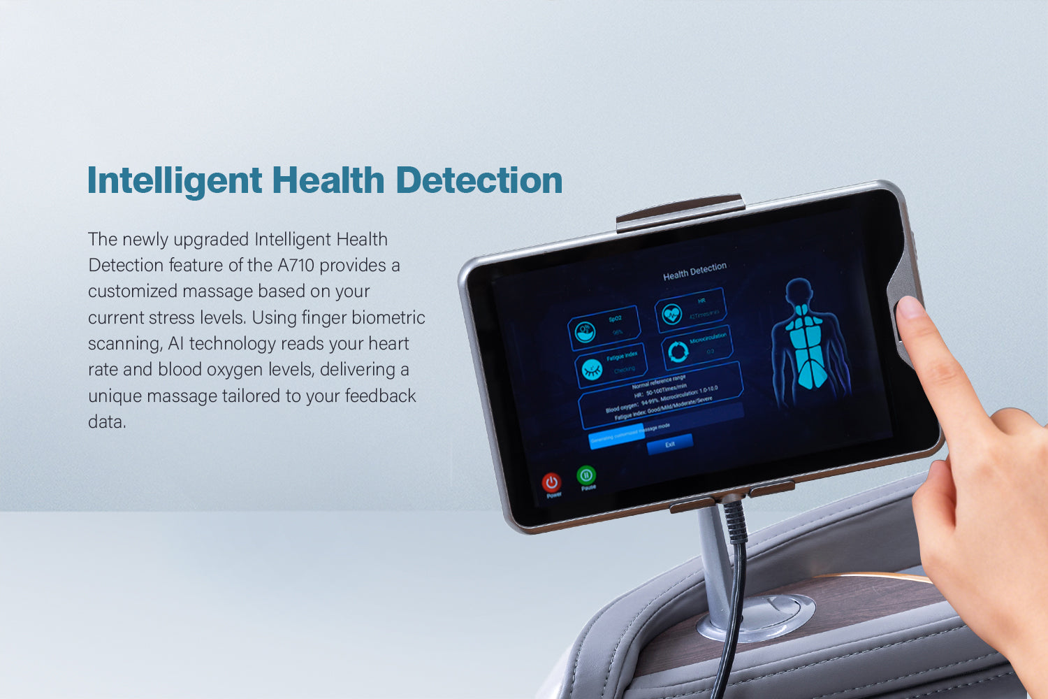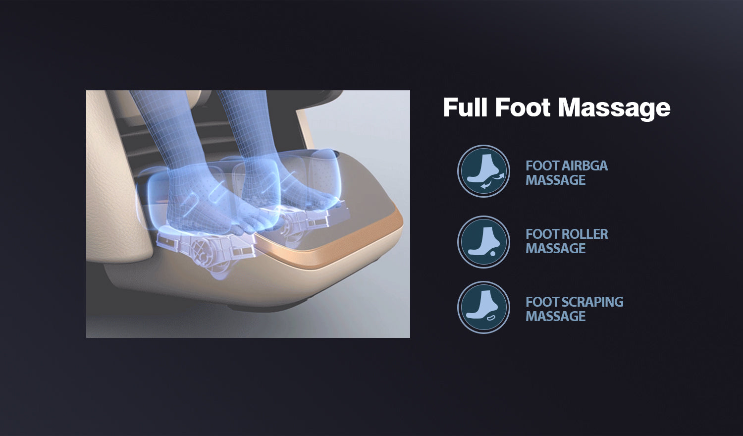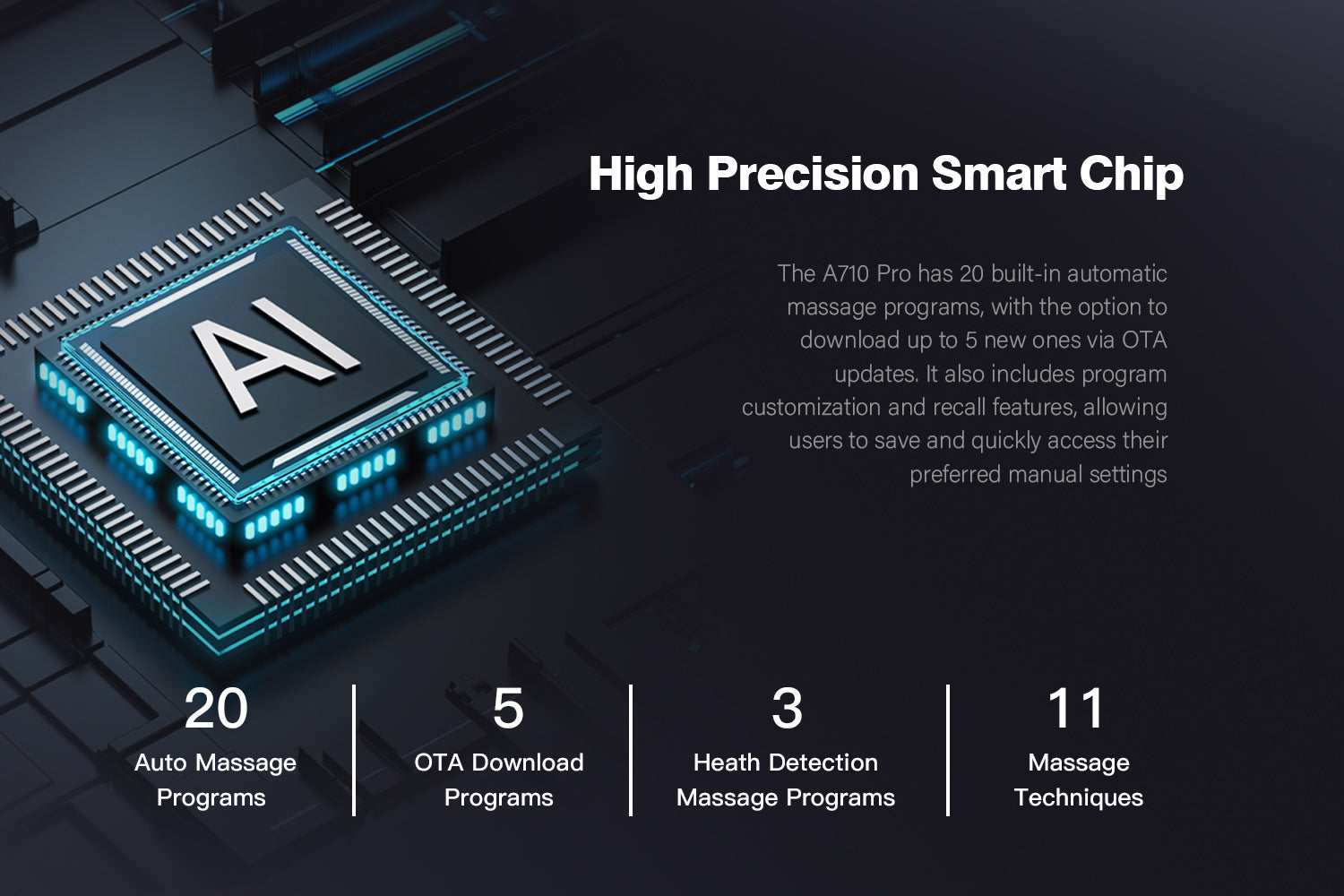 Advanced 4D Massage Mechanism Over the Air (OTA) Wifi Software Update Health Detection APP Control SL Long Track Massage from Neck to Hamstring area Program Customization & Recall Calf & Foot Roller Massage Automatic Footrest Extension Calf Airbag Kneading Massage Real Full Body & Zero Gravity Massage Touch Screen Remote & Quick Access Buttons Voice Command Control Wireless Charging Bluetooth